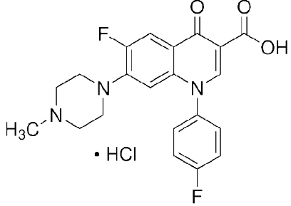 別名6-氟-1-(4-氟苯基)-7-(4-甲基哌嗪-1-基)-4-氧代喹啉-3-甲酸 鹽酸鹽;雙氟沙星鹽酸鹽;6-Fluoro-1-(4-fluorophenyl)-1,4-dihydro-7-(4-methylpiperazino)-4-oxo-3-quinolinecarboxylic acid hydrochloride