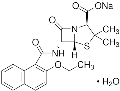 別名萘夫西林鈉; (2S,5R,6R)-6-[(2-乙氧基萘-1-甲酰)氨基]-3,3-二甲基-7-氧代-4-硫雜-1-氮雜雙環(huán)[3.2.0]庚烷-2-甲酸鈉鹽一水合物;Sodium (2S,5R,6R)-6-[(2-ethoxynaphthalene-1-carbonyl)amino]-3,3-dimethyl-7-oxo-4-thia-1-azabicyclo[3.2.0]heptane-2-carboxylate hydrate; Nafcillin sodium monohydrate